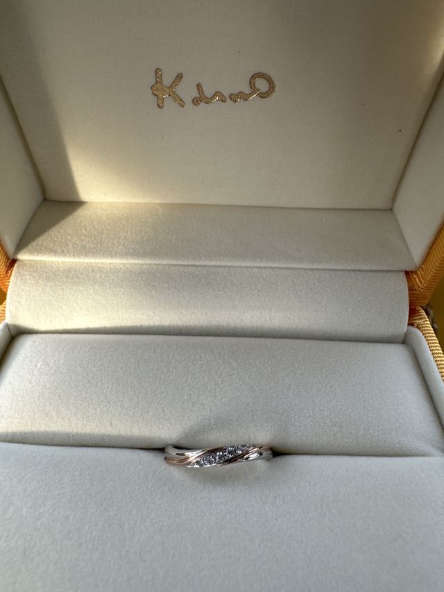 普段ゴールドのアクセサリーが多いため、結婚指輪らしいシルバーをベースにしつつ、ピンクゴールドを入れて他のアクセサリーとも馴染むようなデザインにしていただきました。手があまり大きくないため、細く軽ウェーブがかった形にしました。