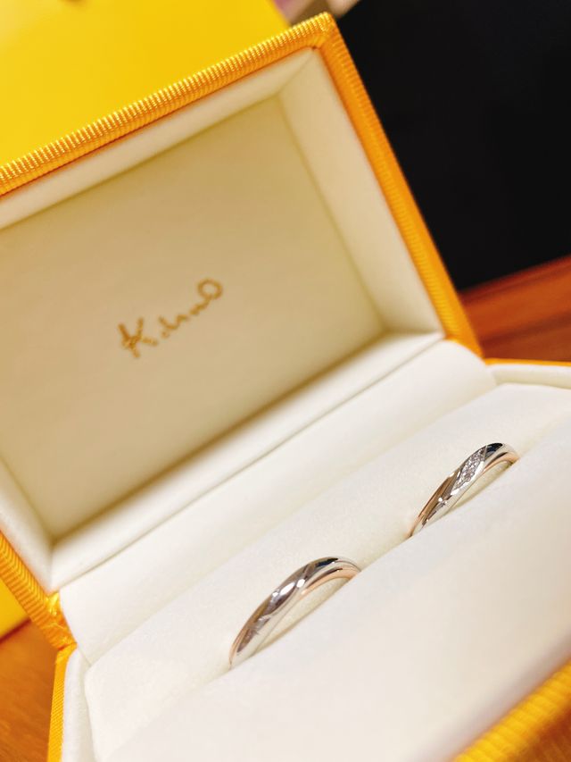 2色で作られている指輪が中々ないので、こちらの商品が気に入りました。また、セミオーダーで石の数を減らしたり、デザイナーさんが作成してくれた刻印を入れられたりして、夫婦のオリジナリティを出せて良かったです。
