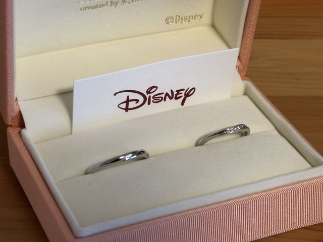 何店舗かまわって、ディズニーだけでなくシンプルだけど少し遊び心がある指輪を探し求めて辿り着きました。泡みたいに小粒なダイヤが輝き、男性のリングはシンプルだけどひねりの変化があり,飽きがこないそんなデザインが気に入りました。