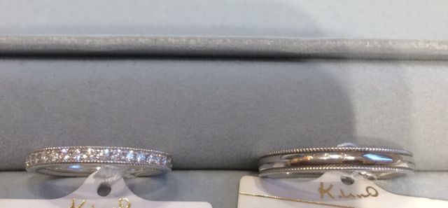 ハーフエタニティの指輪が気になっていましたが、他のデザインと比較して彼の指輪とのペア感があまりないのが悩んでいました... このデザインは男女共に周囲にミル打ちがあり、デザインが可愛いだけでなく、ペア感もあるのが気に入りました。
