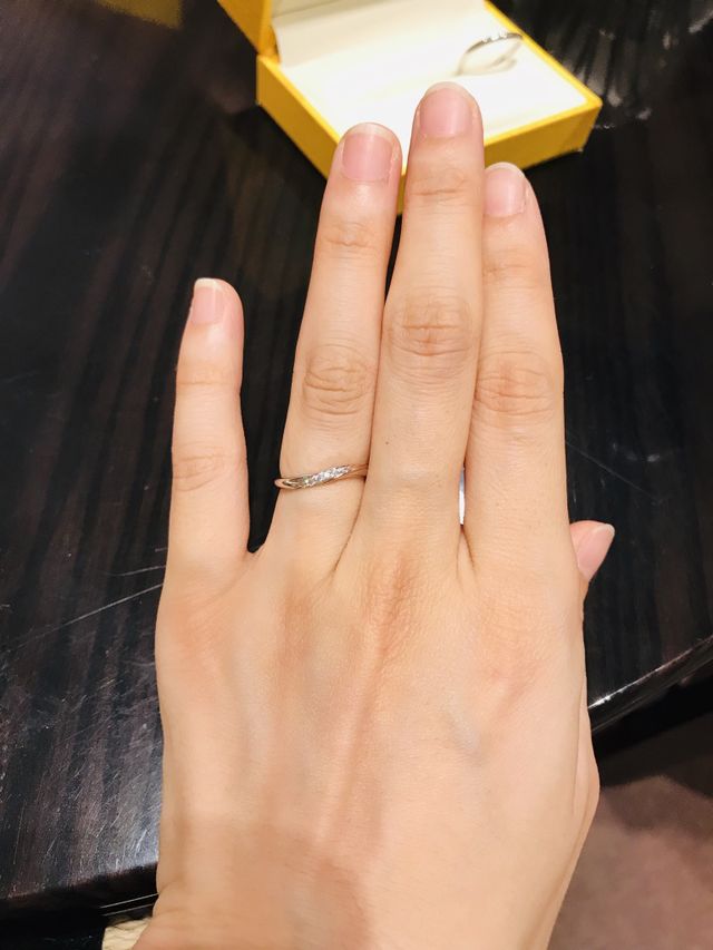 指が細長く見えるデザイン・付け心地に違和感がない物を探していました。何店舗か見学へ伺うもどちらかがNGの場合があり、悩んでいました。ケイ・ウノでは、デザインもデザイナーさんと相談して決められて、既製品で付け心地も良かったので決めました。