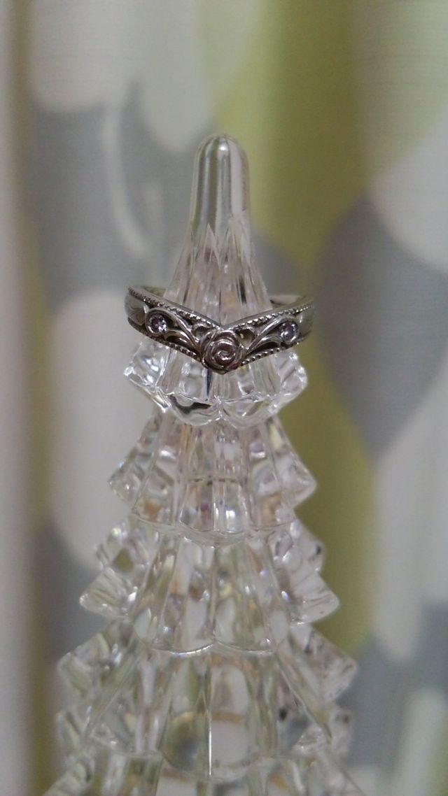 指が短いのでV字にしてもらい、薔薇のモチーフでサイドは透かし彫り。something blueにちなみ、ブルーダイヤを入れてもらいました。