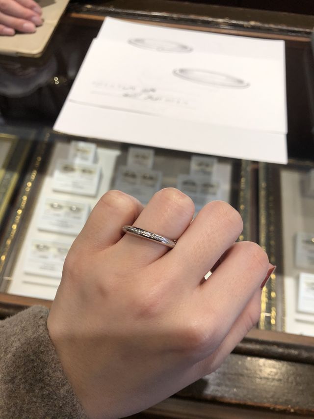 プラチナのシンプルなデザインですが、ミルが全面にありそれがポイントになっていて可愛かったです。結婚指輪感がそんなに強くないのでファッションの邪魔になる事なくいいなーと思いました。付け心地も良く、付けている感じがあまりなかったです。