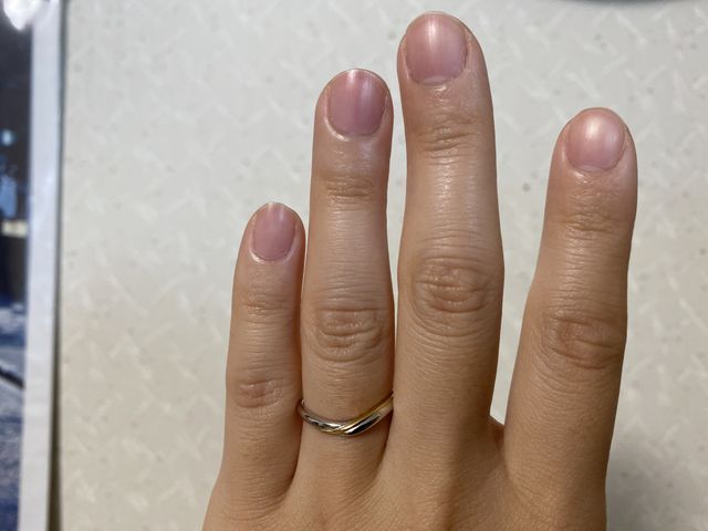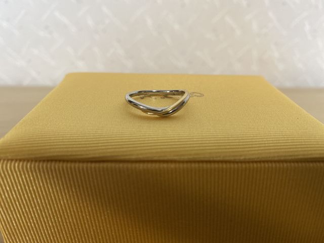 私はゴールドのリング、彼はプラチナのリングが希望だったのでプラチナベースでゴールドが少し入ったものをオーダーしました。形はwave型が指にしっくりはまったのでwave型を選びました。外にダイヤが付いているデザインはあまり好きではないので内側にダイヤを埋め込んでいただきました。