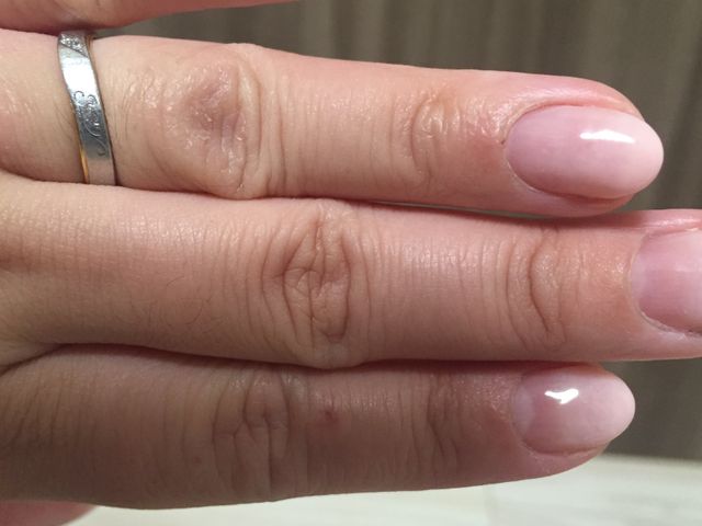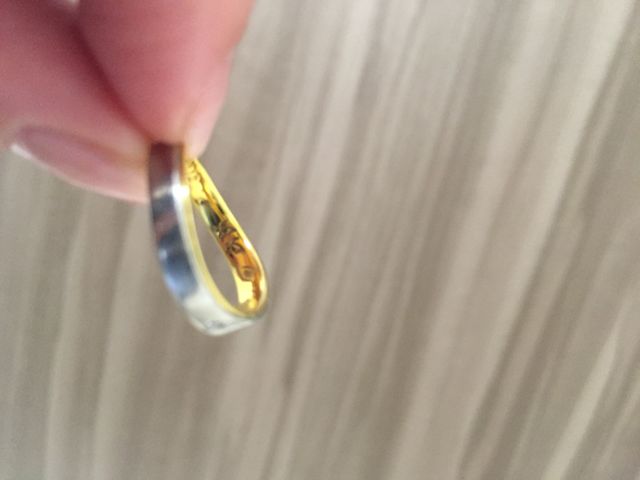 私は指が短くて太いので、長く見えるデザインでお願いしたらこの様な波の様なデザインに、そしてゴールドとプラチナを入れたかったので、傷が行きやすい外側にプラチナを内側にゴールドで外側からさりげなくゴールドが見える様にしました。