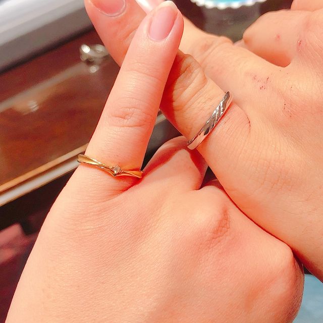 女性のものは、まっすぐなラインですが、真ん中のダイヤの方へいくに従って細くなるデザインなので、とても綺麗でした。