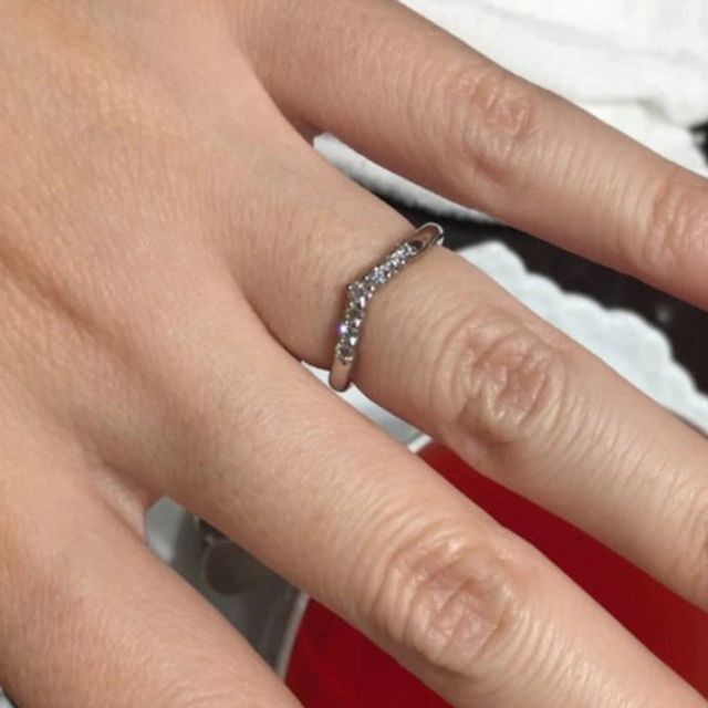 メレダイヤがたくさん入ったV字型のフォルムで個性的であり他ではあまり見かけないデザインであることが気に入りました。プラチナのなめらかな質感によりつけ心地が良いですし、リングの幅もちょうど良く指が綺麗に見えますね。