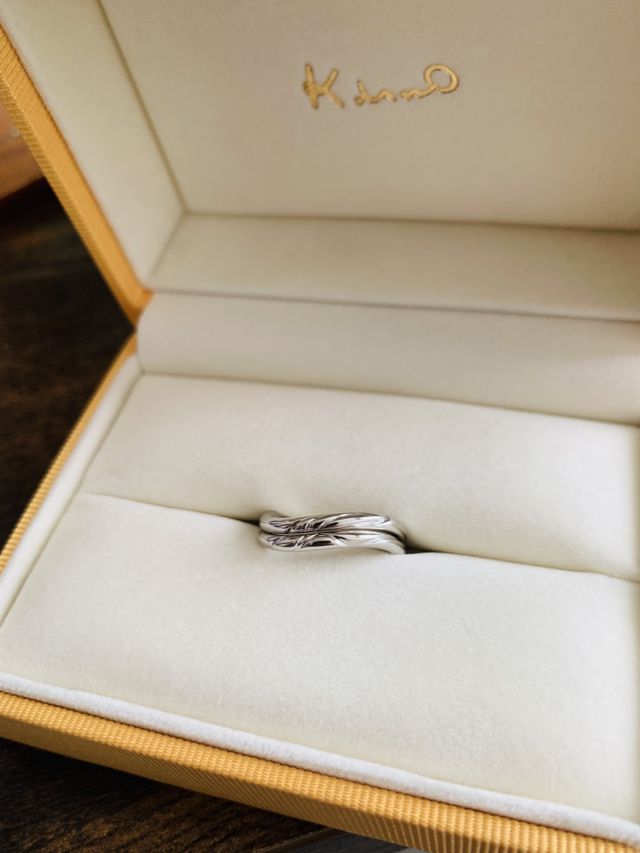 ケイウノさんのホームページを見ていたところ、二つのリングを重ねると柄になる指輪を見つけ、これや!と思いました。2人のイニシャルを彫ってもらいました。また、指輪の内側にはお互いの誕生石と誕生花を入れ、世界に一つだけの指輪が出来ました。