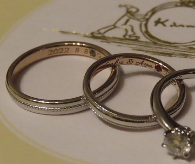 ふたりともダイヤ無しのデザインを希望していましたが、シンプルになりすぎるのもつまらないと思い悩んでいました。色々なアイデアを伝えて、作成可能なのか・価格はどのくらいになるのか等を相談しながら作ることができました。