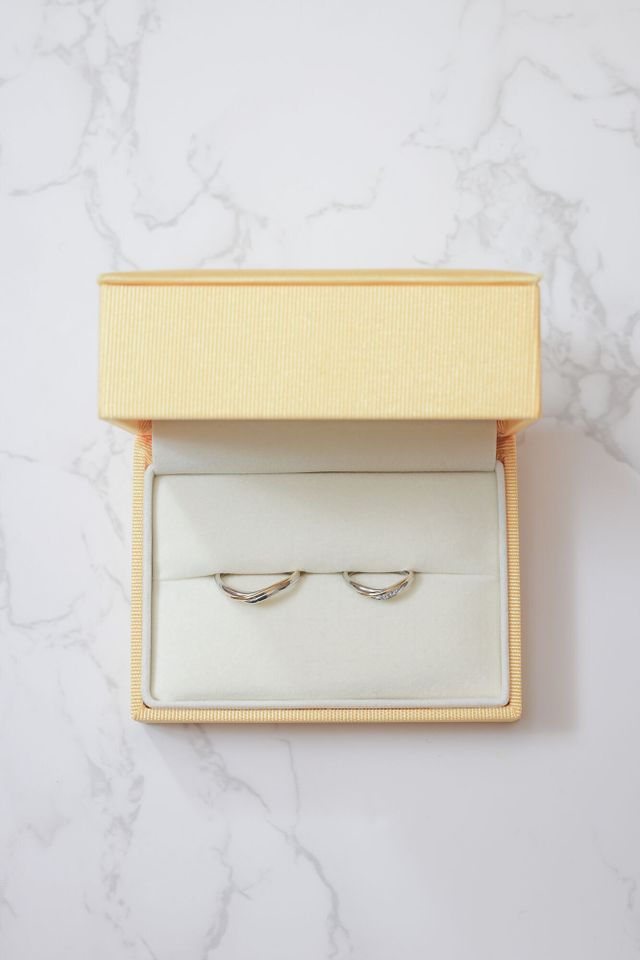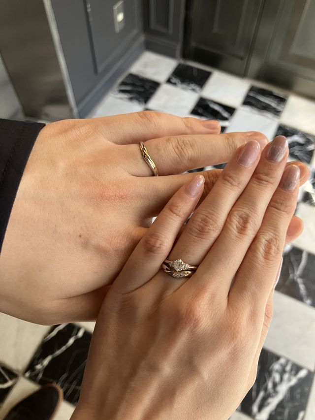 プラチナとゴールドのコンビネーション、ウェーブのデザインで探していましたが、各ブランドに一種類あればいい方で、唯一複数のデザインがあったのがケイウノさんでした。また既製品であっても、ダイヤモンドの数の増減やリング幅を変更してオーダーできるところが良かったです。