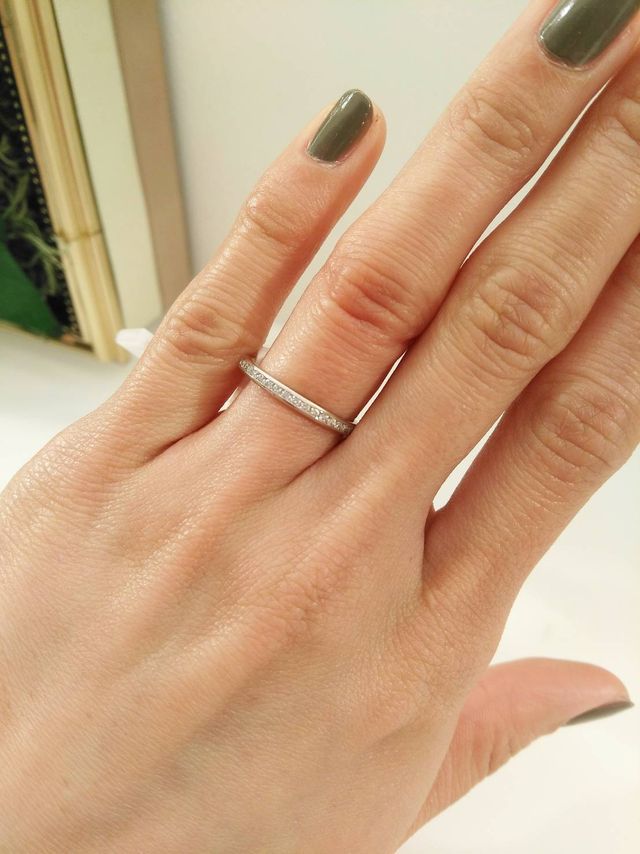 鍛造の結婚指輪を探していたところ、デザインもシンプルでとても気に入りました。ダイヤモンドがしっかりと埋め込まれているため、引っ掛かりもなく表面は滑らかでつけ心地が最高です。また、ダイヤモンドの品質もよく上品な輝きが特徴的でした。