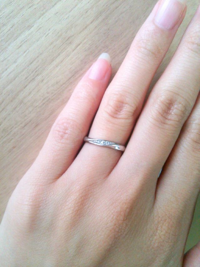 試着前は、結婚指輪はシンプルなもので良いと思っていたのですが、いざ見てみるとラインが入っていたりストーンがついてたりと種類が豊富。ストーンがあるものとないものを比較してしまうと、ないとシンプルすぎる…。試着した結果、斜めにウェーブしている方が指が綺麗に見えたので、それに少しストーンが入ってるものにしました。