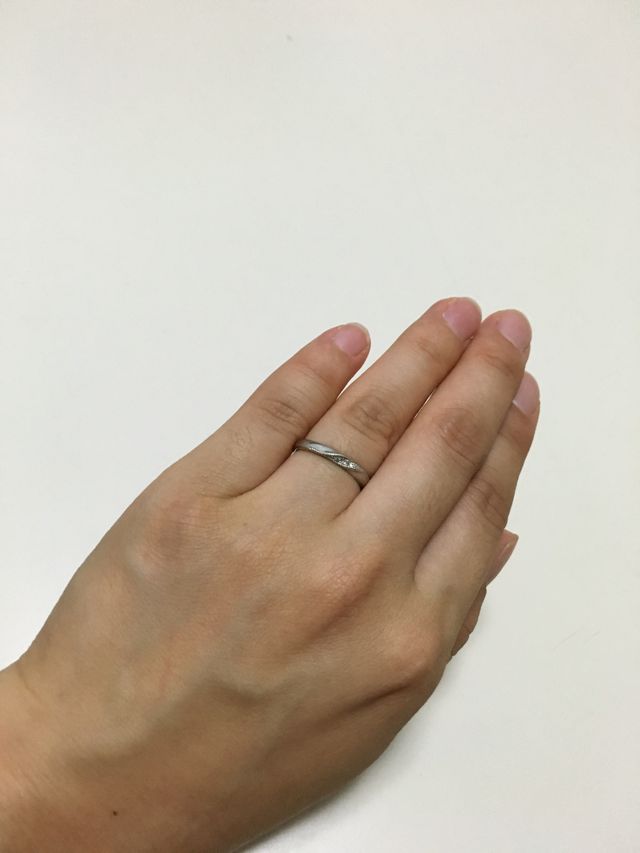 シンプルだけど人とあまりかぶらない個性的なカーブになったデザインに一目惚れしました。私は指が短いためできるだけ細めの指輪を探していたので、その点もちょうどよかったことと、予算もペアで購入しても20万弱なところが決め手でした。