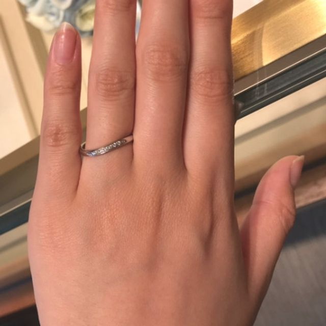 金属、プラチナの品質が高く滑らかな感じだった事とシンプルで扱いやすいデザインであった事、そしてサイズ感がちょうど良かった事などが選んだ理由です。ラインの太さはそれほどでもないですが、ダイヤの輝きが綺麗で存在感はあります。
