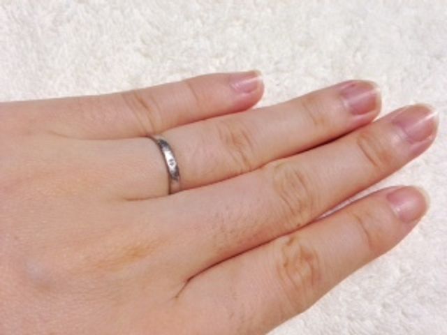 まず一番気に入ったのはシンプルなデザインです。女性用はワンポイントでメレダイヤが付いているのも気に入りました。また、指輪に大きな金額をかけたくなかったため、5万から6万という価格帯でプラチナなのも私たちにはピッタリでした。