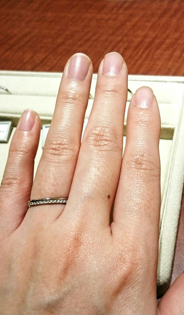 結婚指輪の中では細身で華奢なリングです。幅の半分にダイヤが配置されており、お洒落で上品なところに一目惚れしました。他店ではあまり見ない雰囲気のリングです。私は手ががっちり大きめなのあまり似合いませんでしたが、手が大きくないか指がすらっとした方だったらとても似合うと思うのでぜひお試しください。また、このデザインで幅が広めなものもありました。そちらも素敵で、がっちりした手の男性にも合わせやすいと思いました。