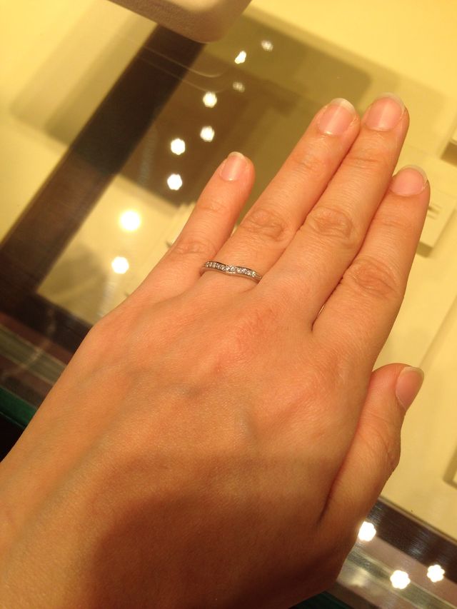 ハーフエタニティーでダイヤがたくさん使われていて、存在感があります。周りがしっかりしているのでひっかかりも気にならなくてよさそうです。エンゲージと合わせてキャトルリング風にもできそうなところが気になりました。