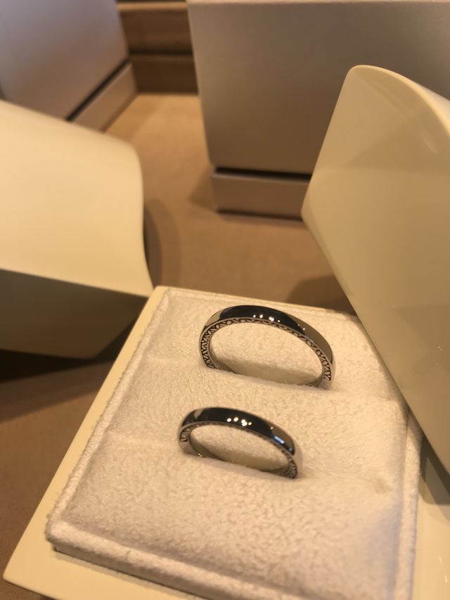 婚約指輪と同じブランドで合わせやすくバランスを考えて選んだ。シンプルながらよく見るとアクセントがあって、さりげなさがおしゃれだと思った。細すぎず太すぎず、理想のデザインだったこと、着け心地もよかった。