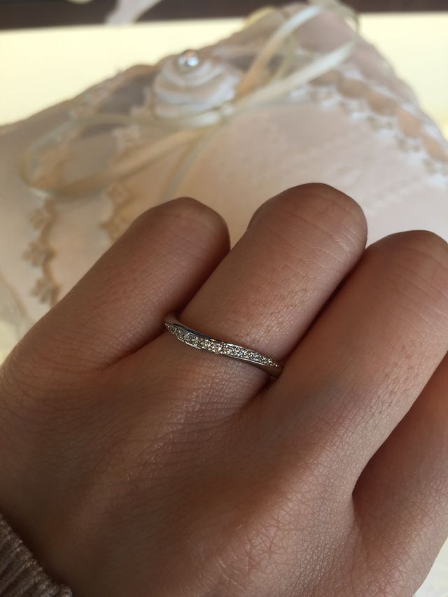 ストレートタイプのハーフエタニティとは違い、ねじれがあるデザイン。その分、指が綺麗に見えた気がしました。キラキラ感も程よくあり、良かったと思います。セレナーデ(恋歌)というデザインの名前も素敵でした。