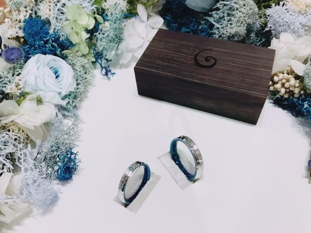 指輪は彼の希望もあり、ブルーの発色を希望。発色する金属のジルコニウムだけですと、かなり軽くて華奢な印象だったため、表面はプラチナで内側はジルコニウムの二重構造で作っていただきました。