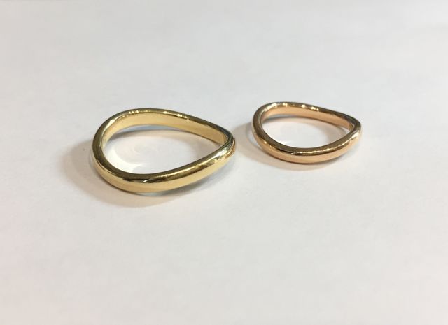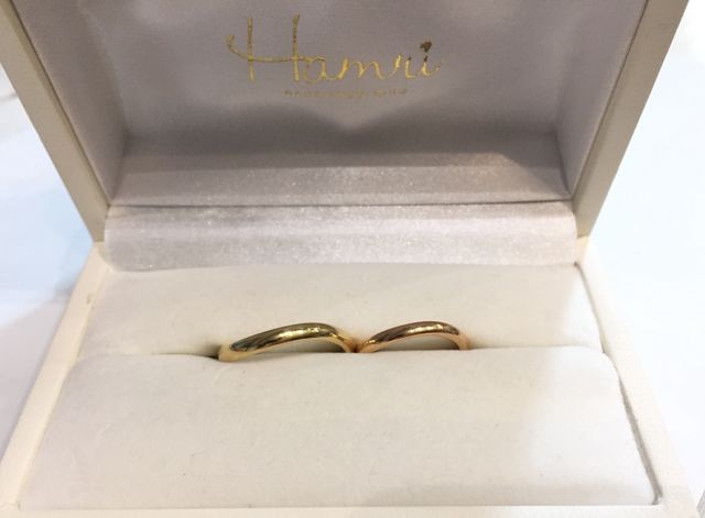 ホームページで先輩カップルの動画を拝見し、とても楽しそうに作る姿を見てハムリさんに惹かれました。それに加え、店内がとても可愛かったのが決め手です。指輪はそれぞれ好みの貴金属を選び、ウェーブでペア感を出しました。