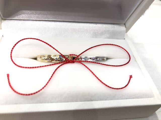婚約指輪でお世話になり、結婚指輪の制作もこちらにお願いすることとなりました!2人でデザインを決めましたが、お互いに世界に一つだけの個性的な指輪を作りたいことから形、質感、素材、ダイヤなどかなり細かくこだわりました!
