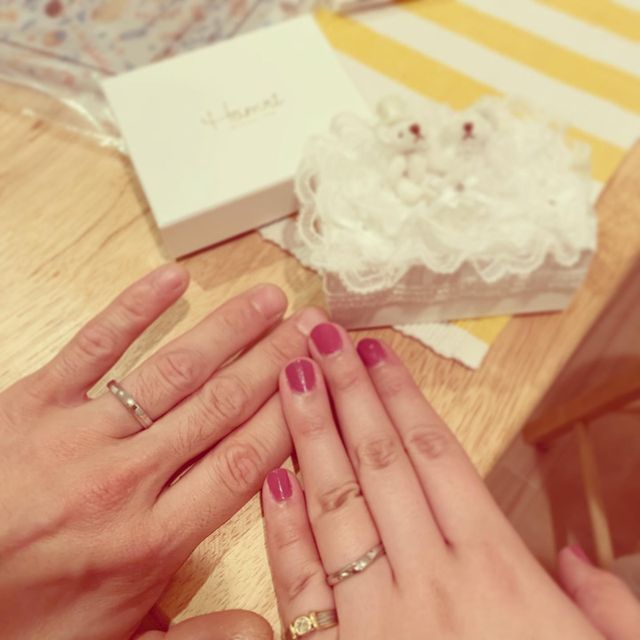 指輪のデザインは過去の作った方たちの中で気になったものをお互いに決めてからお店へ行きました。完全に一緒ではなく自分たちのオリジナル要素も欲しくて細かいところもこだわりました。特にお気に入りなのは内側につけた誕生石です。わたしは主人の誕生石、主人はわたしの誕生石を付けています。