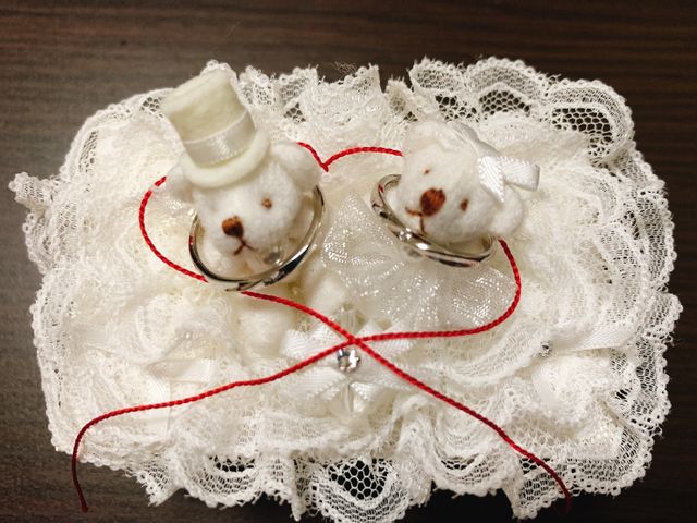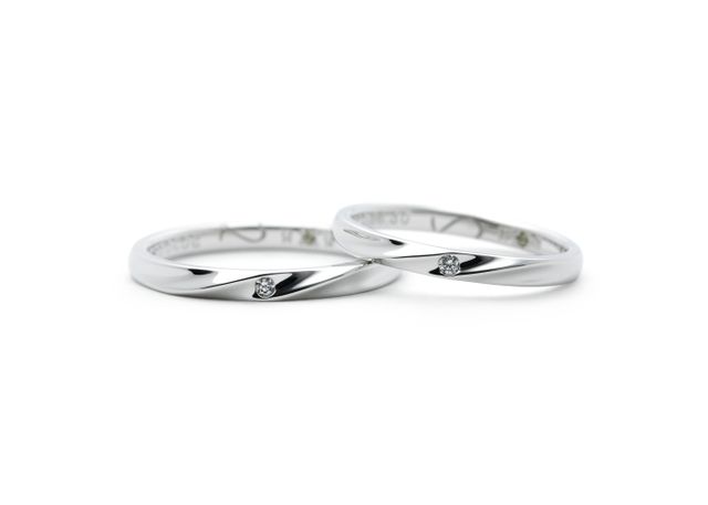 仕事などでも普段着けられるように、また歳をとった時にも恥ずかしくなく、不自然にならないようにシンプルを第一に作りました。ただダイヤモンドは入れたかったので、少し控えめですが入れました。また入籍した月の石を内側に入れ、2人のイニシャルも入れました。そして、指輪を二つ重ねると赤い糸でハートを描いたようなデザインがお気に入りです。