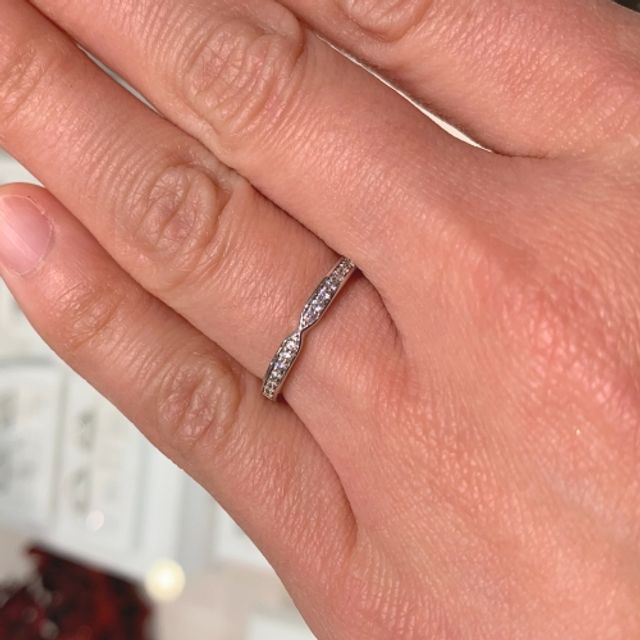 リングの中心が特徴的なデザインをしており、多数のダイヤが入っているのでキラキラとしてきれいです。基本的にはシンプルなストレートラインなのでダイヤの数が多いですが上品にまとまっていると思います。サイズ感的にもちょうど良く自分の指に合っていますね。