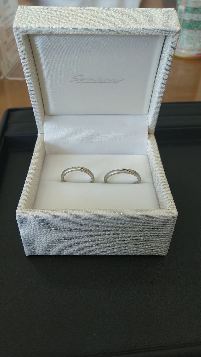 シンプルで結婚指輪だけでも素敵だし、一緒に付けても素敵な感じになりました。