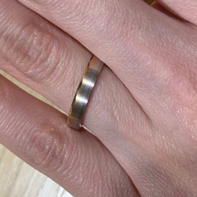 イエローゴールドやピンクゴールド、プラチナなどが組み合わさった個性的なリングであり不思議な存在感があります。色合いがとても綺麗ですし実際に試着してみると和風の感じもあるので指にピッタリと合いました。色々なファッションにも合わせやすいと思います。