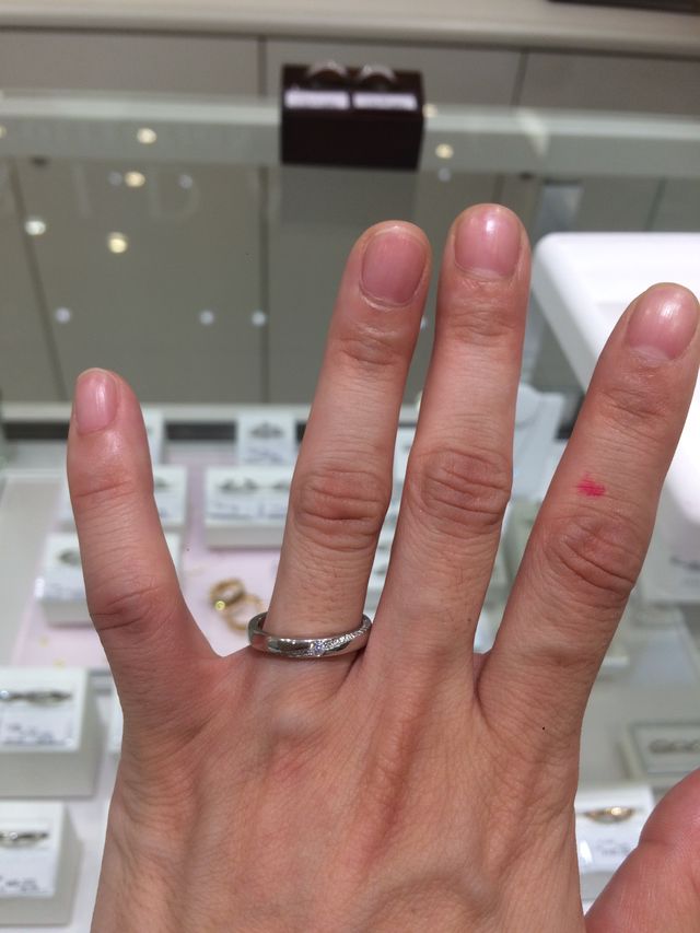 デザインが珍しく凝っていて、流れ星のように内側にもぐるっと一周ダイヤが入っていて、ぱっと見はシンプルながらも、ゴージャスなところが気に入りました。指輪本体の太さもしっかりと太く、存在感があって良いと思いました。