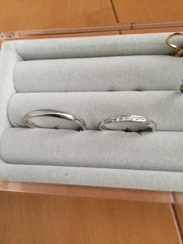 少しねじれたデザインがおしゃれ。女性の指輪はダイヤが少し入っていて、アクセントになって綺麗だと思った。