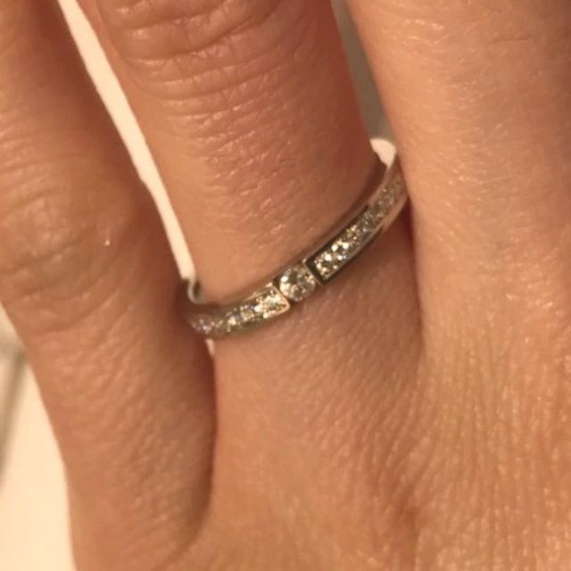 センターのダイヤの他にサイドに幾つもダイヤが埋め込まれておりダイヤの輝きがキラキラとして存在感があるのが魅力的なリングです。全体的に幅は細身で指がすっきりと見える部分も気に入っていますし、プラチナの質感もしっかりとしています。