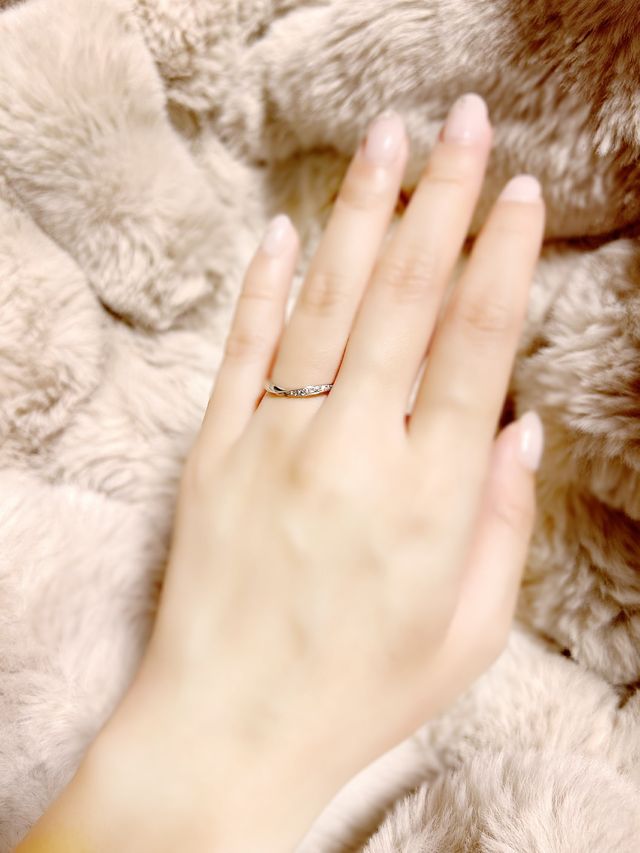 動きがあって指も綺麗に見えてデザインも可愛いです。決め手となったのはダイヤモンドのカラーを選べるところでした!ブルーが良かったのでとっても満足です!