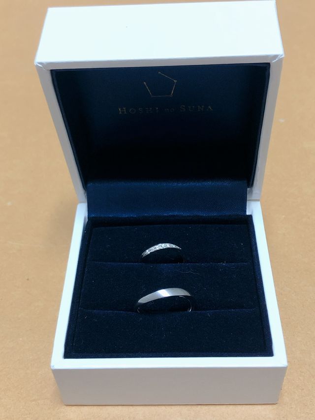 指輪にはあまり詳しくない2人だったし、優柔不断で何が良いのか分からなくなっていたが、お店の方にアドバイスや提案をして頂いたおかげで、自分たちにぴったりのデザインを選ぶことが出来た。手が小さめなので、細めの指輪を提案して頂いた。