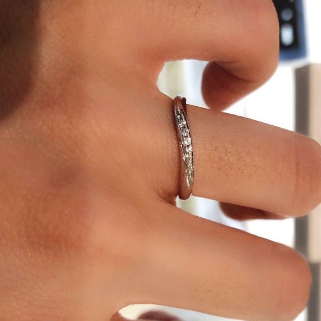 滑らかなウェーブラインと並んだメレダイヤの輝きがきれいな指輪ですね。デザイン的にストレートラインのものよりも指に馴染みが良く、すっきりと見せてくれます。またダイヤモンドはそれほど主張しすぎず、上品な印象です。