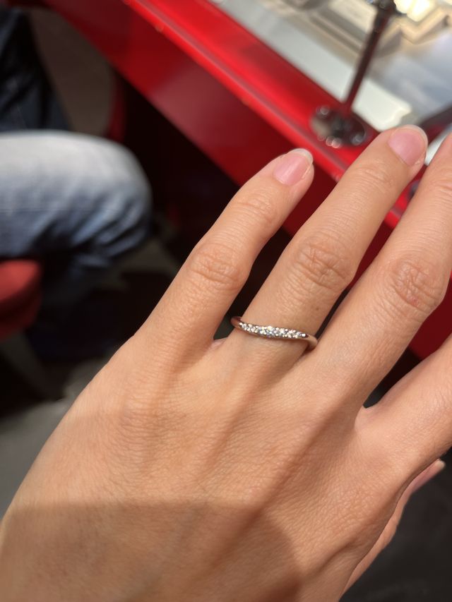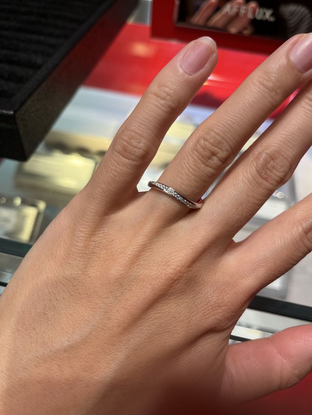 2種類の指輪で悩んでおり、一つは逆ウェーブで指がとても綺麗に長く見えるところ、後はダイヤモンドも数が多くどの角度から見てもダイヤモンドの煌めきを見るところが気に入りました。二つ目はたてづめでダイヤモンドが留められている指輪だったので輝きが全然違いました。