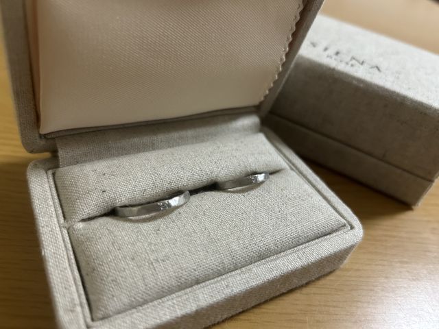 シンプルながらしっかり綺麗なデザインです。マット、鎚目orウェーブ、ダイヤ控えめ、両方ともシルバー、等こだわりをたくさん出せる自由さがあります。私たちはどちらも結婚指輪らしい結婚指輪を避けたかったので、キレイめな基本の形+セミオーダーは理想を叶えてくれました。