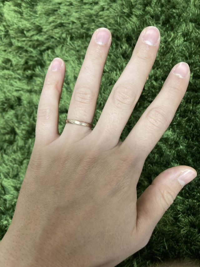 普段指輪をつけないので、できるだけ手に馴染みがよく目立たないものを前提に、記念品であるものなので、特別感が感じられるものを探していました。さまざまな色やデザインがあり、迷いましたが実物を試着させていただき、肌の色に合うものを選びました