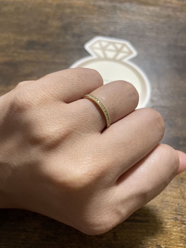 狙っていた指輪より着用した時が1番可愛かったです。男性用はマットなデザインかつシンプルで可愛いなと思いました。女性用は逆にキラキラしすぎて派手なのでは?と思ったけど細めの指輪だったので指輪単体でみるよりも着けた時が意外とシンプルに見えたのでこれがいい!と決めれました。色味もゴールドで肌の色に割と馴染んでいるためか派手さがなく良かったです。