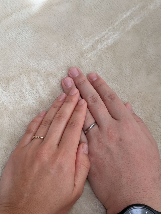 アンティーク調のものが好みなので、ミル打ちのデザインがとても気に入っています。夫の指輪はセットのものではなく、同じブランドでデザインが気に入ったプラチナのものを選びました。