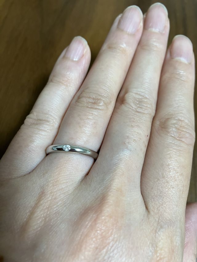 丸みや厚みがあって、なめらかで付け心地が良いです。シンプルですが、とても存在感があります。シンプルなデザインですが、ダイヤモンドもとても綺麗です。プラチナ950なので、家事をする時も安心して着けることができます。