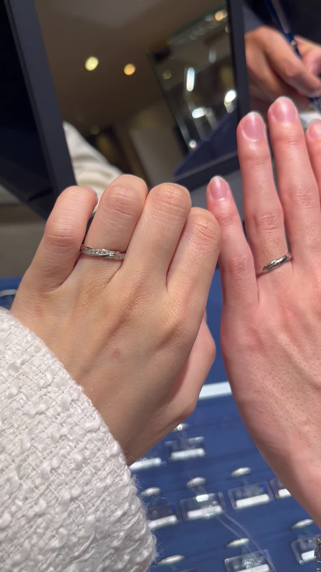 想像以上にたくさんの種類の結婚指輪があってびっくりしました。シンプルなものから個性的なデザインまで、たくさんありました。また、店員さんが教えてくださった通り、どの指輪も付けた時の違和感や「付けてる感」が少なかったです。