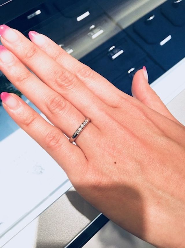 ストレートラインに5粒のダイヤモンドが埋め込まれています。ダイヤモンドが白く輝いていて、本当にきれいでした。指輪に少し太さがありますが、気にならないくらい指通りも滑らかで心地よかったです。シンプルなものではなく「いつ見てもテンションが上がるものがいい」という要望を叶えてくれる指輪だと思います。