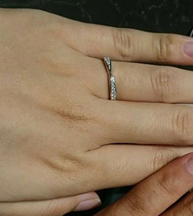 リボン型のフォルムが適度に可愛らしくダイヤモンドの輝きも綺麗なリングです。プラチナ部分の質感が非常に綺麗で内側の仕上げも丁寧なので感触的に柔らかく優しい印象ですね。またシンプルなデザインでもあるので婚約指輪との重ね付けにも合いそうです。