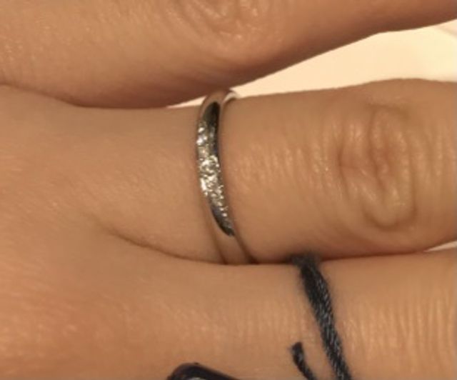 幅は細めのデザインで、まっすぐな指輪に斜めにあしらわれたダイヤモンドが5つほど並んでおり、シンプルながらとてもキラキラときれいです。ダイヤモンドの白さ