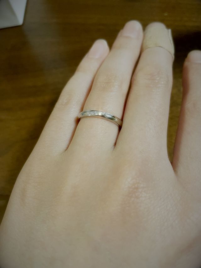 たくさんの種類があり、すごく悩みましたが、毎日付ける結婚指輪なので、シンプルかつ可愛さを重視して選びました。ネジリのラインと派手すぎないダイヤモンドが自分の指には合っており、購入しました。小さいダイヤモンドですが、どの角度から見ても輝いていて気に入りました。
