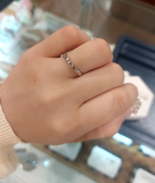 他ではなかなか見ないデザインで最後まで候補に残っていました。色もシャンパンゴールドとはまた違った色味でとても上品です。デザイン性があるので少しファッションリングっぽさもありますが、それが服装を選ばず付けられる魅力でもあると思います。