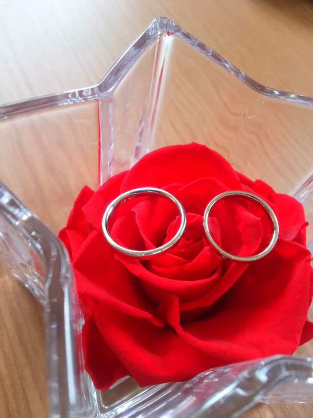 仕事柄、手に違和感を感じてしまう太さのものは厳しいため手に馴染みやすく違和感のないものを選んでいた部分と、また試着をしてみて夫と共にプラチナ、ゴールド色は似合わない部分があったので肌馴染みの良い円やかなこの色にしました。